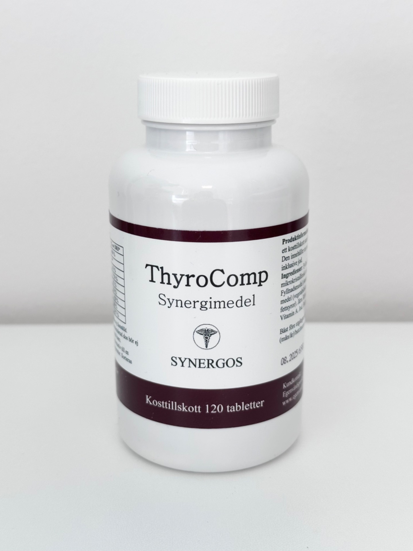 Thyro Comp Synergos är ett kosttillskott som bygger på bredspektrum- och synergiprincipen. Den innehåller en rad vitaminer och mineraler inklusive jod som bidrar till normal produktion av sköldkörtelhormoner och till normal sköldkörtelfunktion.